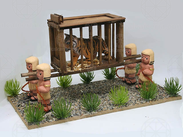 Grupo Egipcios con jaula con parihuelas y fiera de 4 cm. La jaula tiene la puerta abatible para poder cambiar de animal. Medidas 18x10x10 cm. Escena elaborada por Lola.