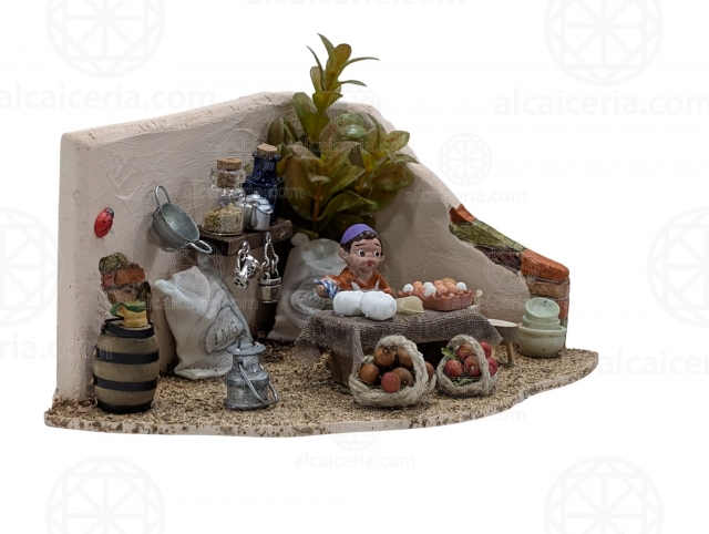 Feeding corner with shepherd. Dimensions: 18 x 14 x 10 cm. Scene created by Lola for the Alborox figurines. This photo is indicative due to the handmade nature of the scene.