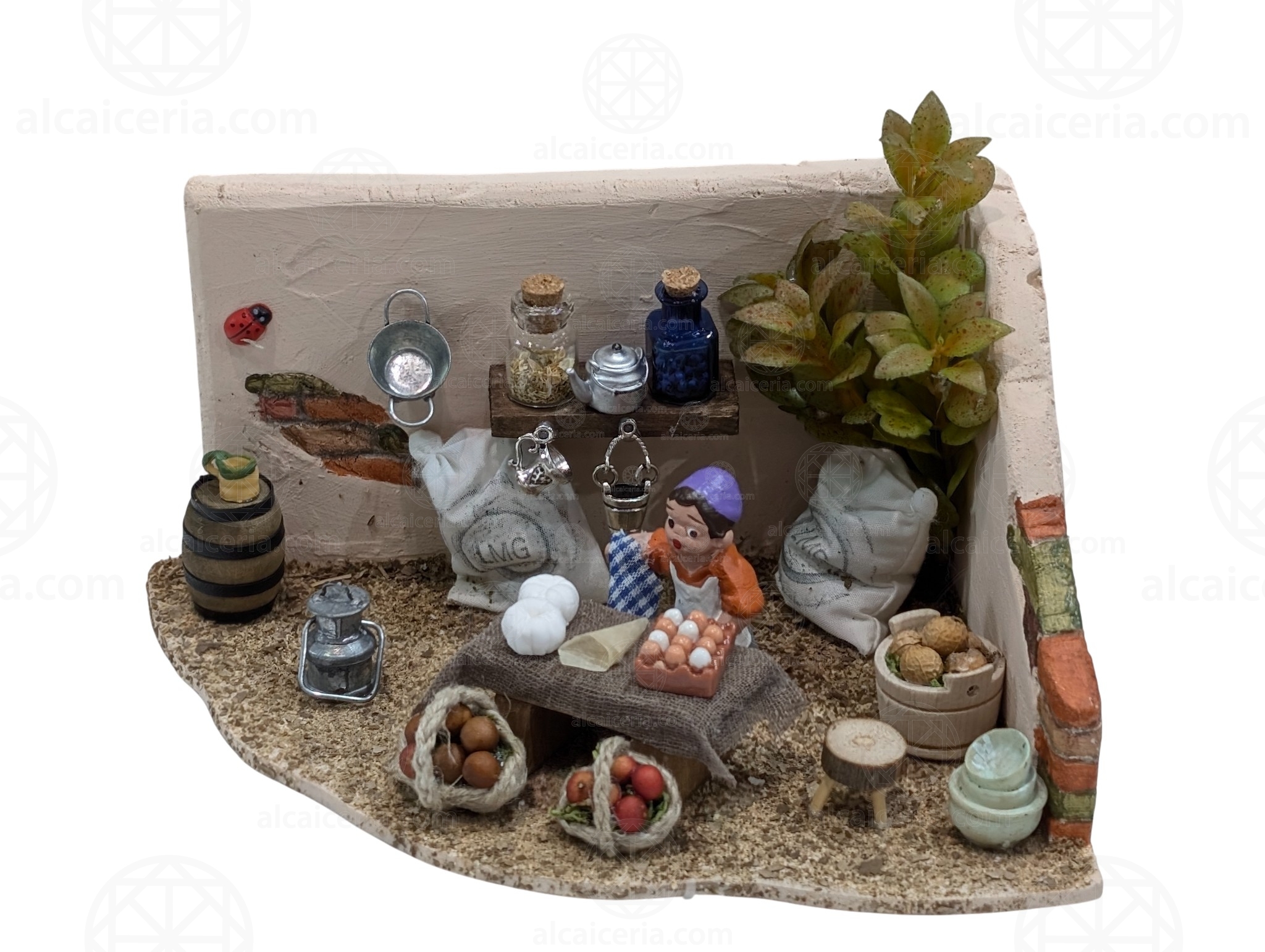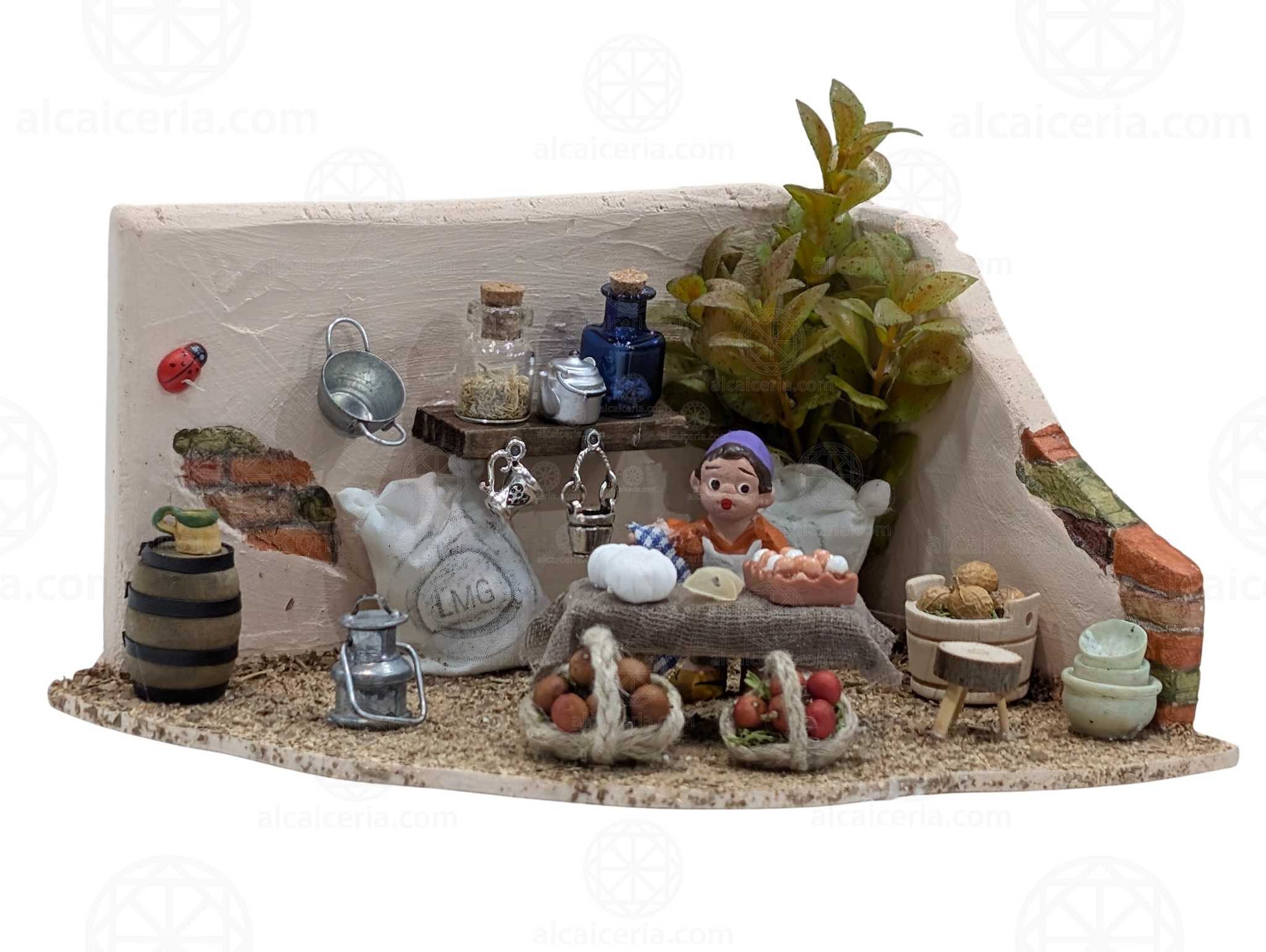Rincón de alimentación con pastor. Medidas 18x14x10 cm. Escena elaborada por Lola para las figuras de Alborox. Foto orientativa debido al carácter artesanal de la escena.