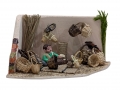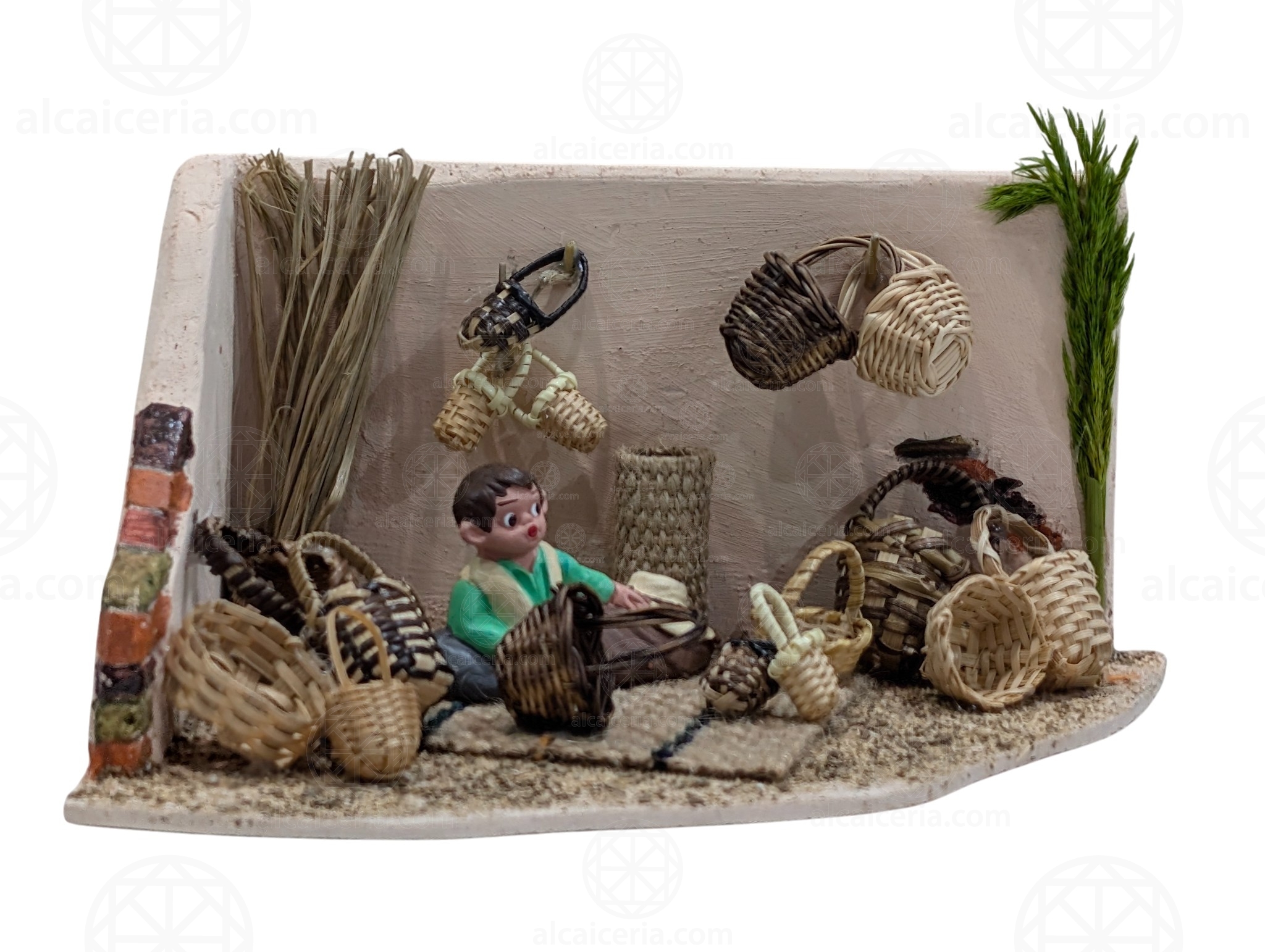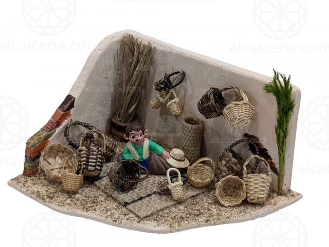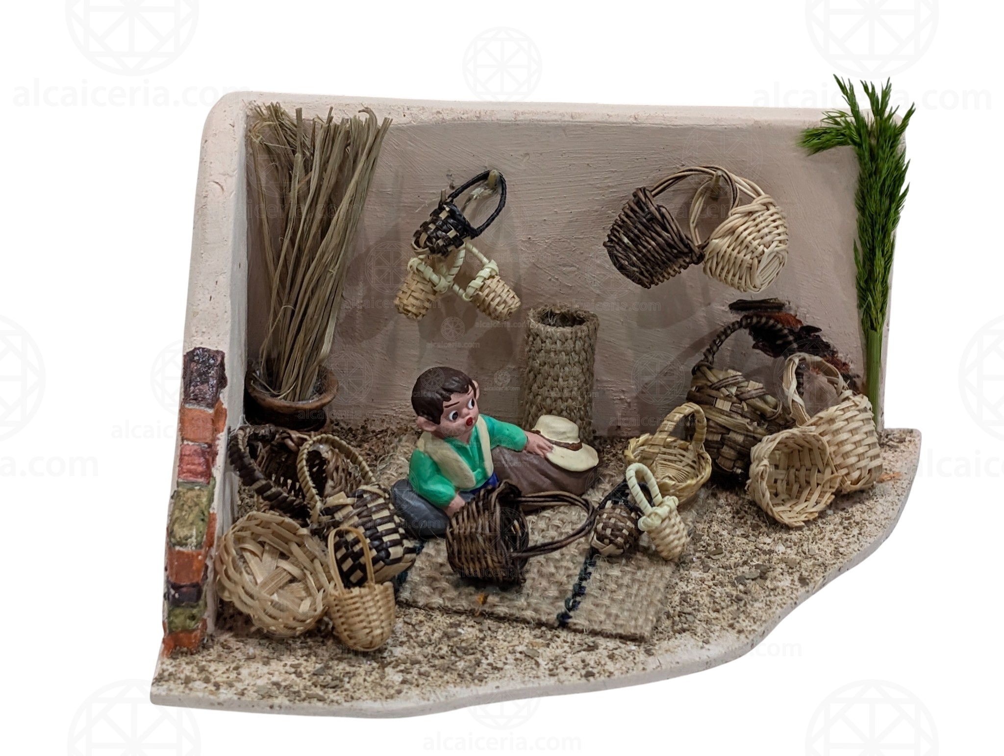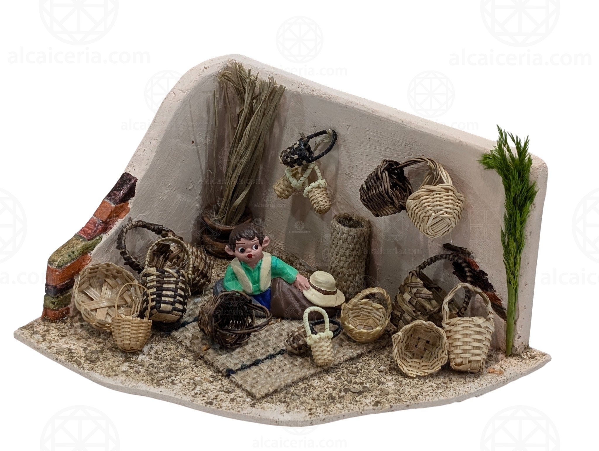 Basket corner with shepherd. Dimensions: 18 x 14 x 10 cm. Scene made by Lola for the Alborox figurines. This photo is indicative due to the handmade nature of the scene.