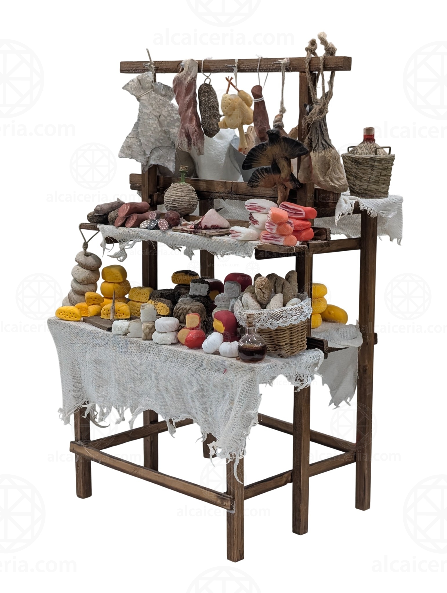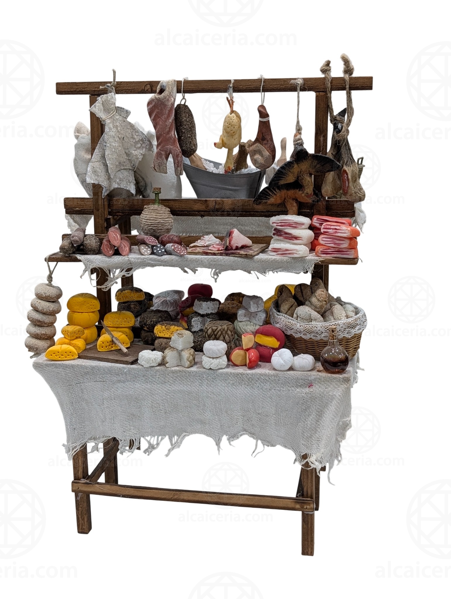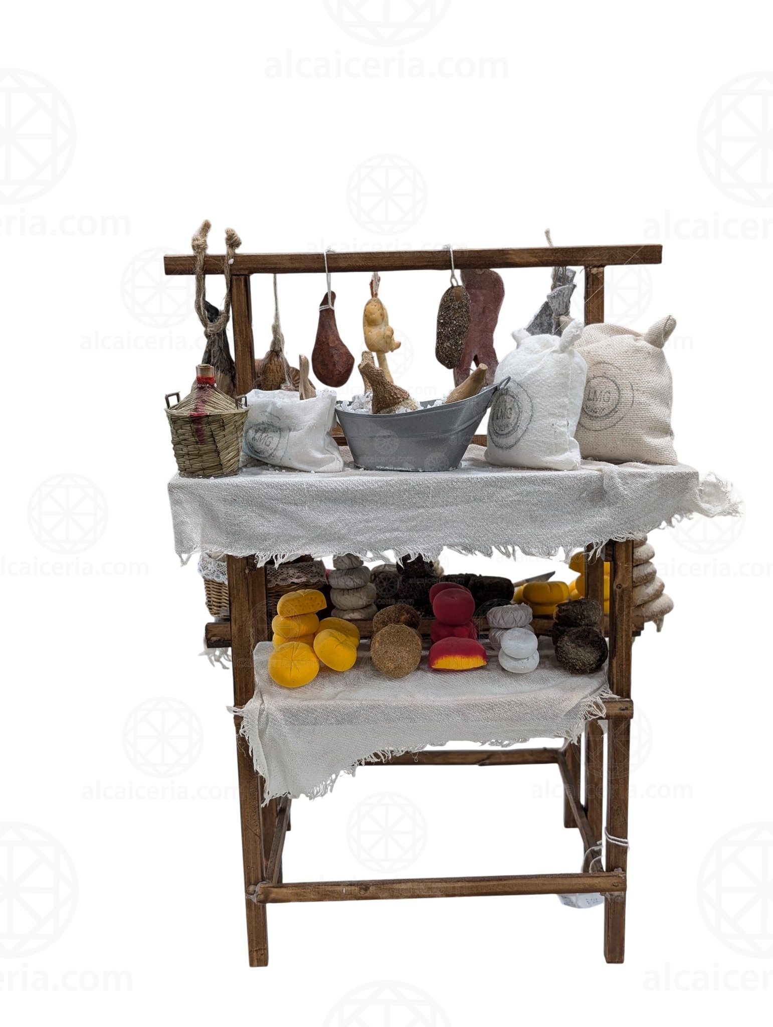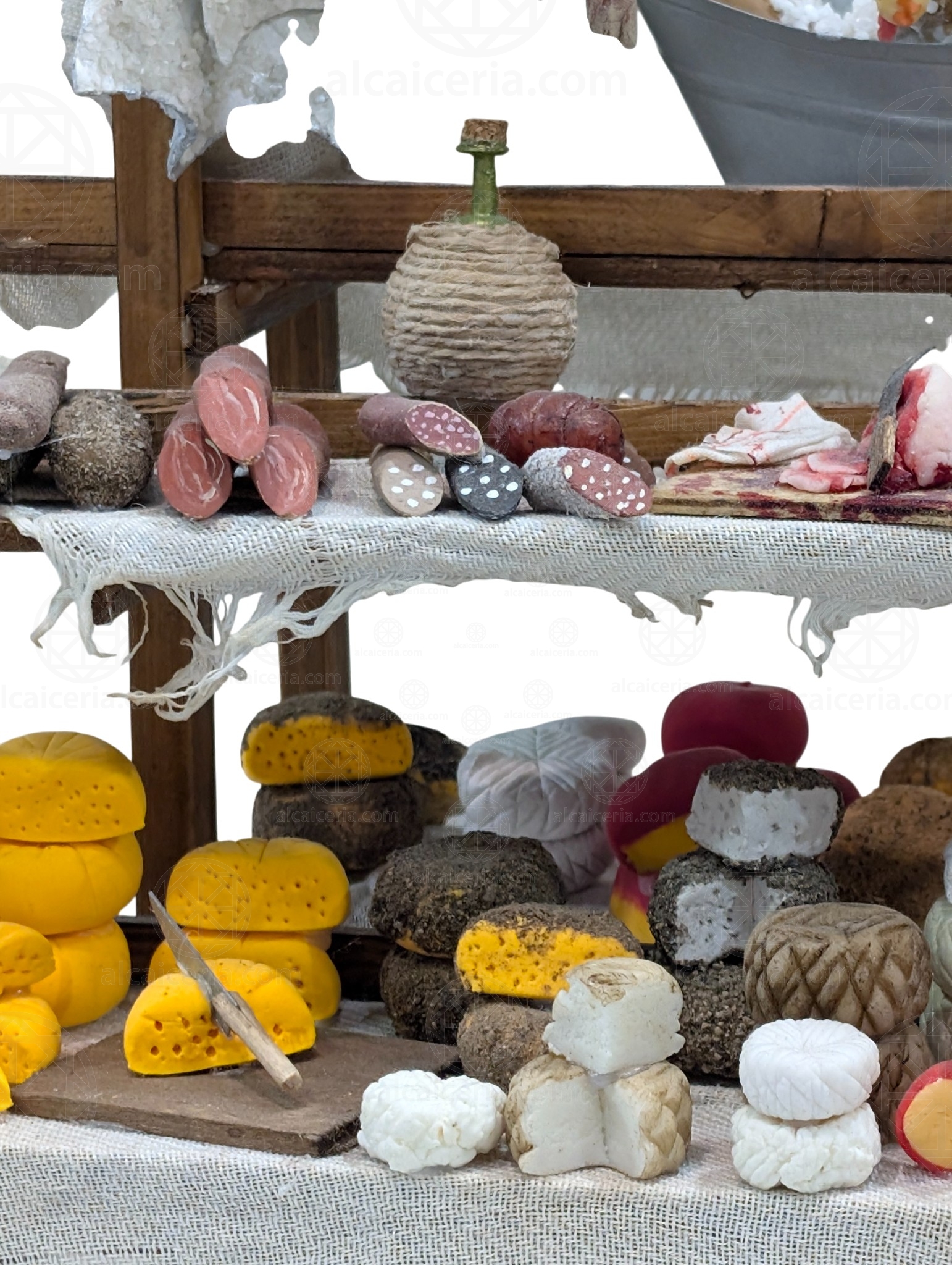 Puesto de Alimentación: Quesos y embutidos ,realizado por Lola. Medidas Largo x Anchox Alto 24x15x35 cm. Para figuras 25-30 cm.