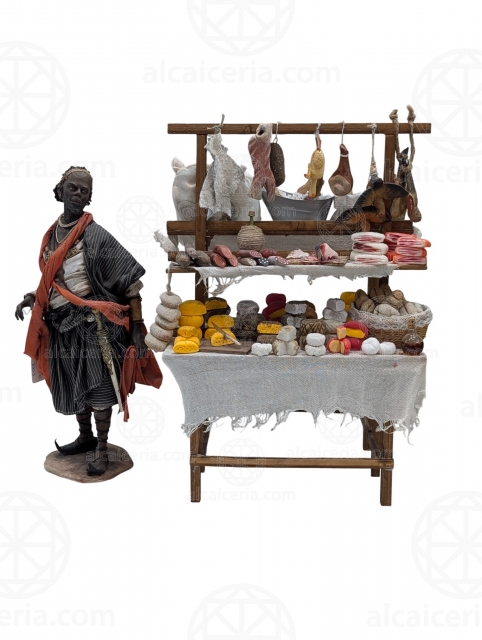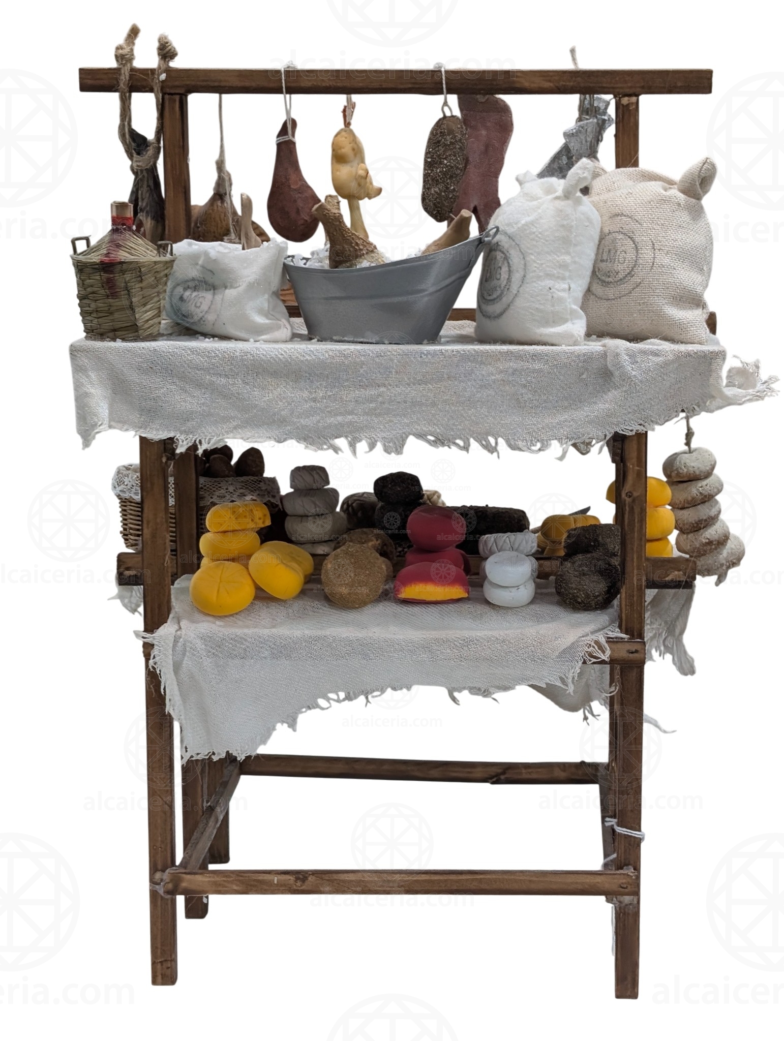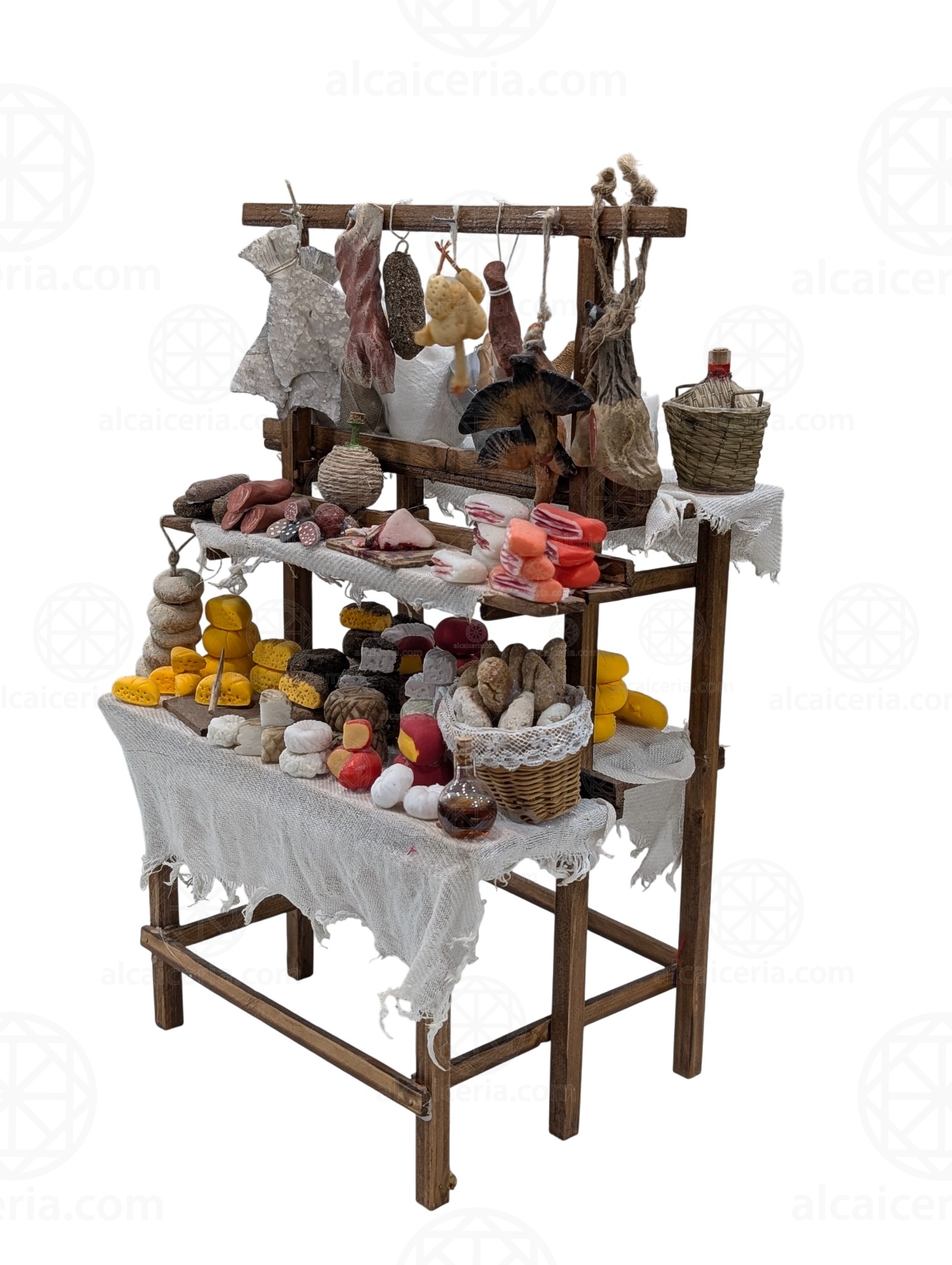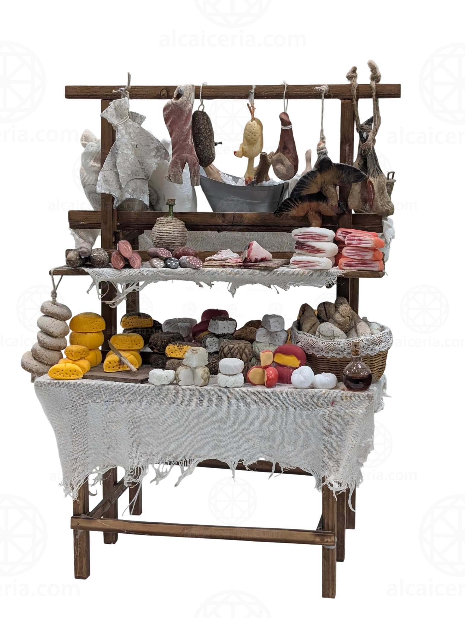 Puesto de Alimentación: Quesos y embutidos ,realizado por Lola. Medidas Largo x Anchox Alto 24x15x35 cm. Para figuras 25-30 cm.
