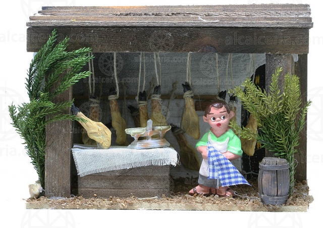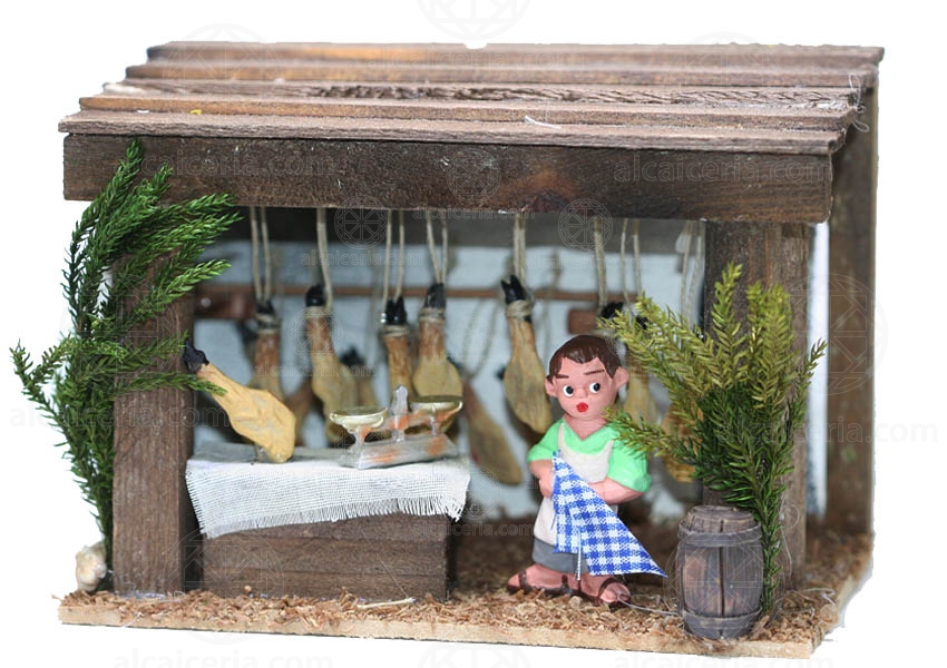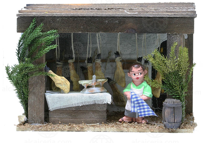 Dryer of hams. Measures 15x10x10.5 cm. Scene elaborated by Lola for the Alborox figures. Orientative photo due to the traditional nature of the scene.
