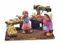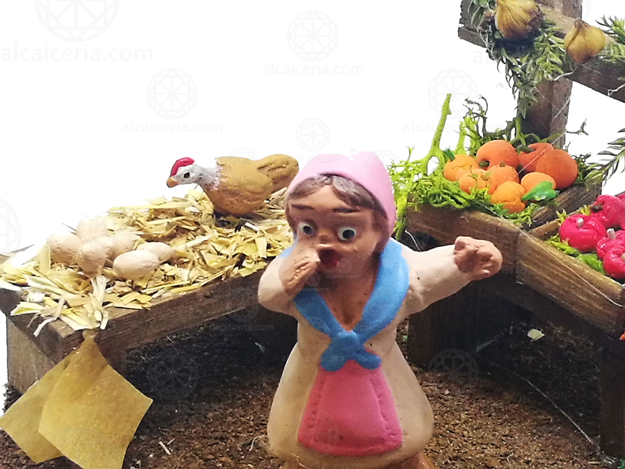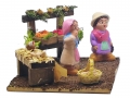 Corner in the market with seller of eggs and vegetables with customer. Measures 10x9x6 cm. Scene elaborated by Lola for the granadino clay figures of Alborox. Orientative photo due to the traditional nature of the scene.