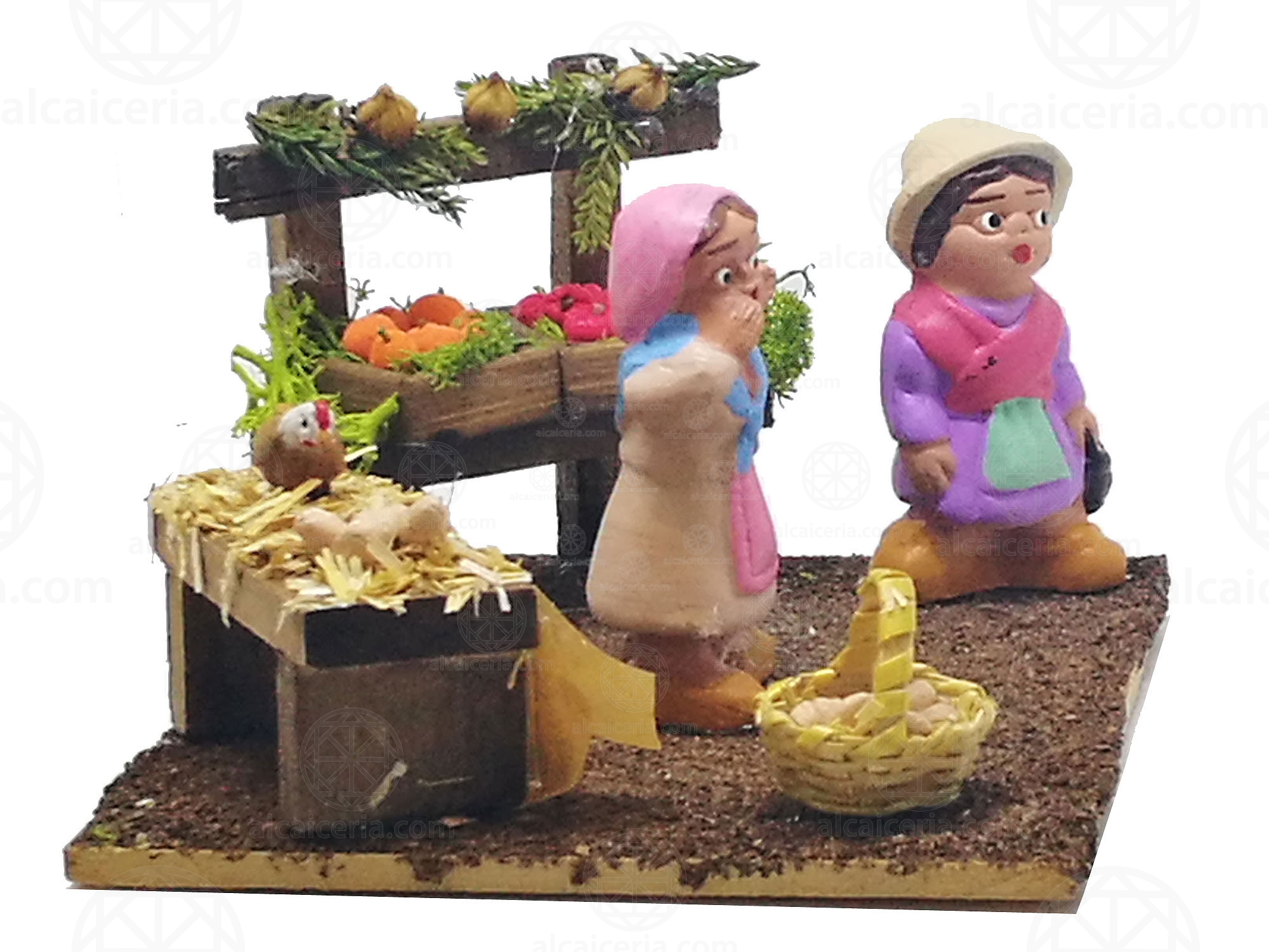 Rincón en el mercado con vendedora de huevos y verduras con clienta. Medidas 10x9x6 cm. Escena elaborada por Lola para las figuras de barro granadino de Alborox. Foto orientativa debido al caracter artesanal de la escena.