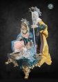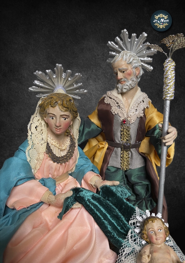 Nativity scene of Saint Joseph of the Booksellers, 25/28 cm Nativity scene with a pedestal and Renaissance architecture. A beautiful work of craftsmanship, the Virgin Mary and Saint Joseph are made according to tradition and dressed as ancient shepherds in the Neapolitan style of the 17th century. Nature dimensions: 20 x 20 x 35 cm. Compact piece with a wooden pedestal.