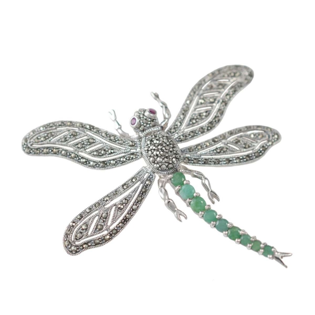 Brooch emerald dragonfly silver. Weight 6 gr. Measures 7 x 7.5 cm.