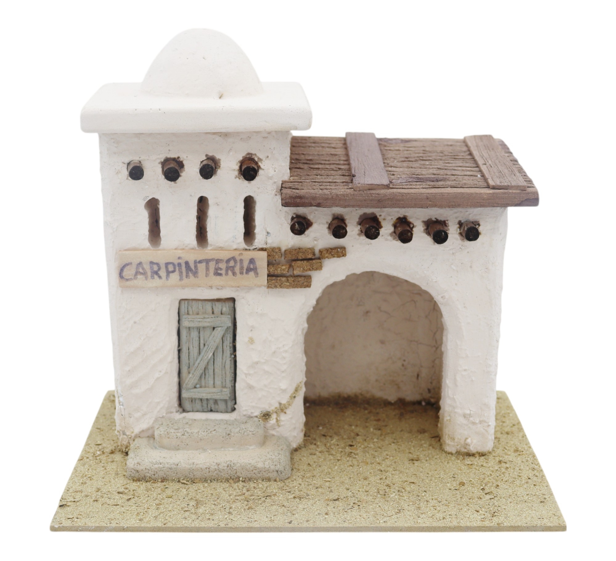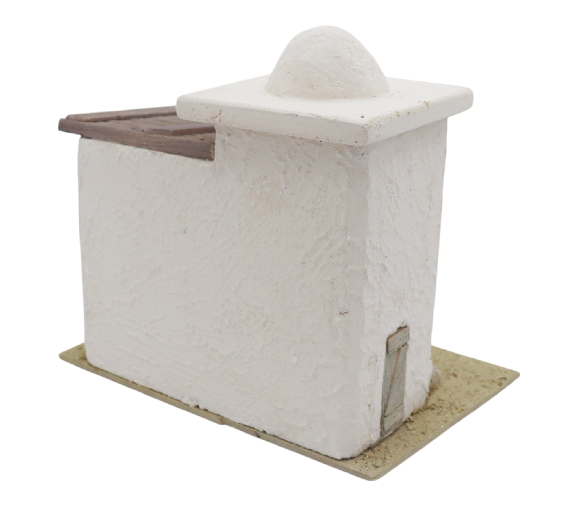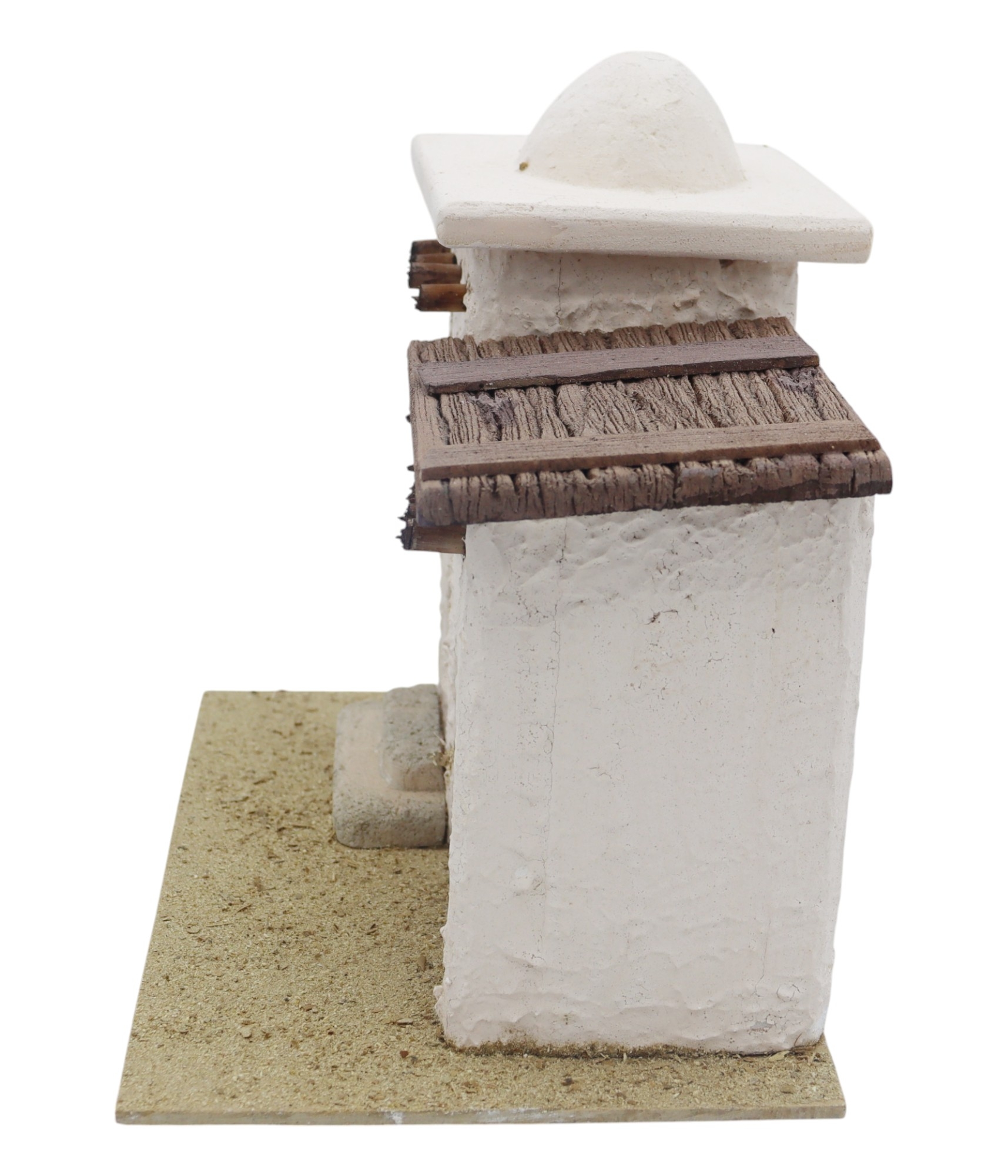 Hebrew inn with two floors and a side porch for 5 cm figures. Measurements: (LxWxH): 18x10x22 cm. Made of wood. Photo is for guidance only due to the handmade nature of the piece.