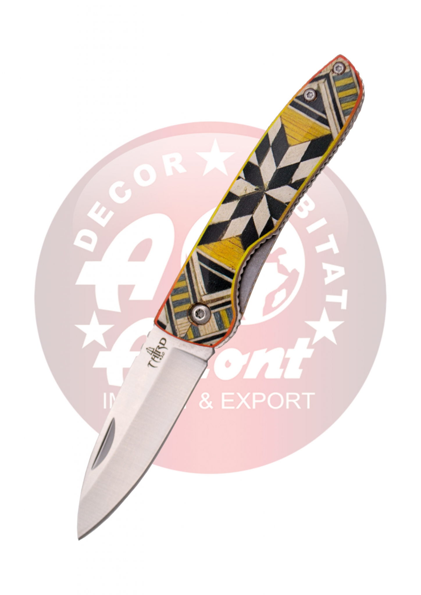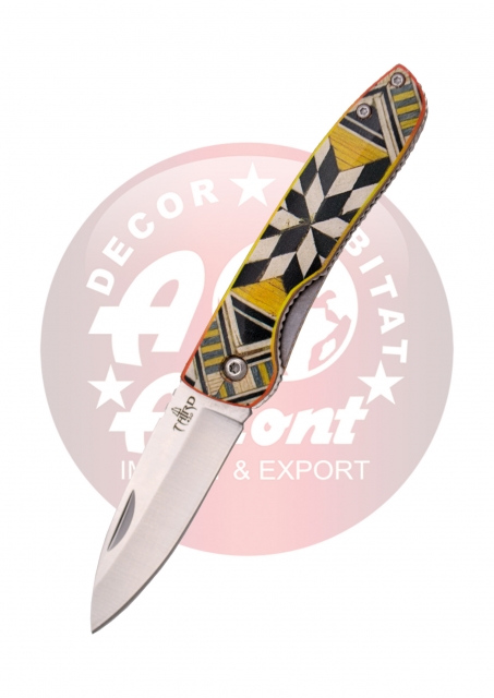 Third model Taracea N12R pocket knife with a 7 cm mirror-polished 420 steel blade and an aluminum handle with a 3D inlay print on both sides. Ref. N12R Model: N12R Handle: Aluminum Blade: 420 steel Blade Size: 7 cm Blade Thickness: 1.8 mm Cutting Depth: 5.8 cm Handle Size: 9.8 cm Total Length: 16.8 cm Weight: 69 g