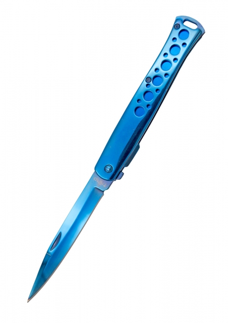 Third N86W stiletto with a polished rainbow titanium-plated aluminum handle and a 10.2 cm polished rainbow titanium-plated stainless steel blade with clip. Ref. N86W Model: N86W Handle: Steel Blade: 420 Steel Blade Size: 10.2 cm Blade Thickness: 2.75 mm Cutting Depth: 9.2 cm Handle Size: 12.6 cm Total Length: 22.8 cm Weight: 138 g With clip