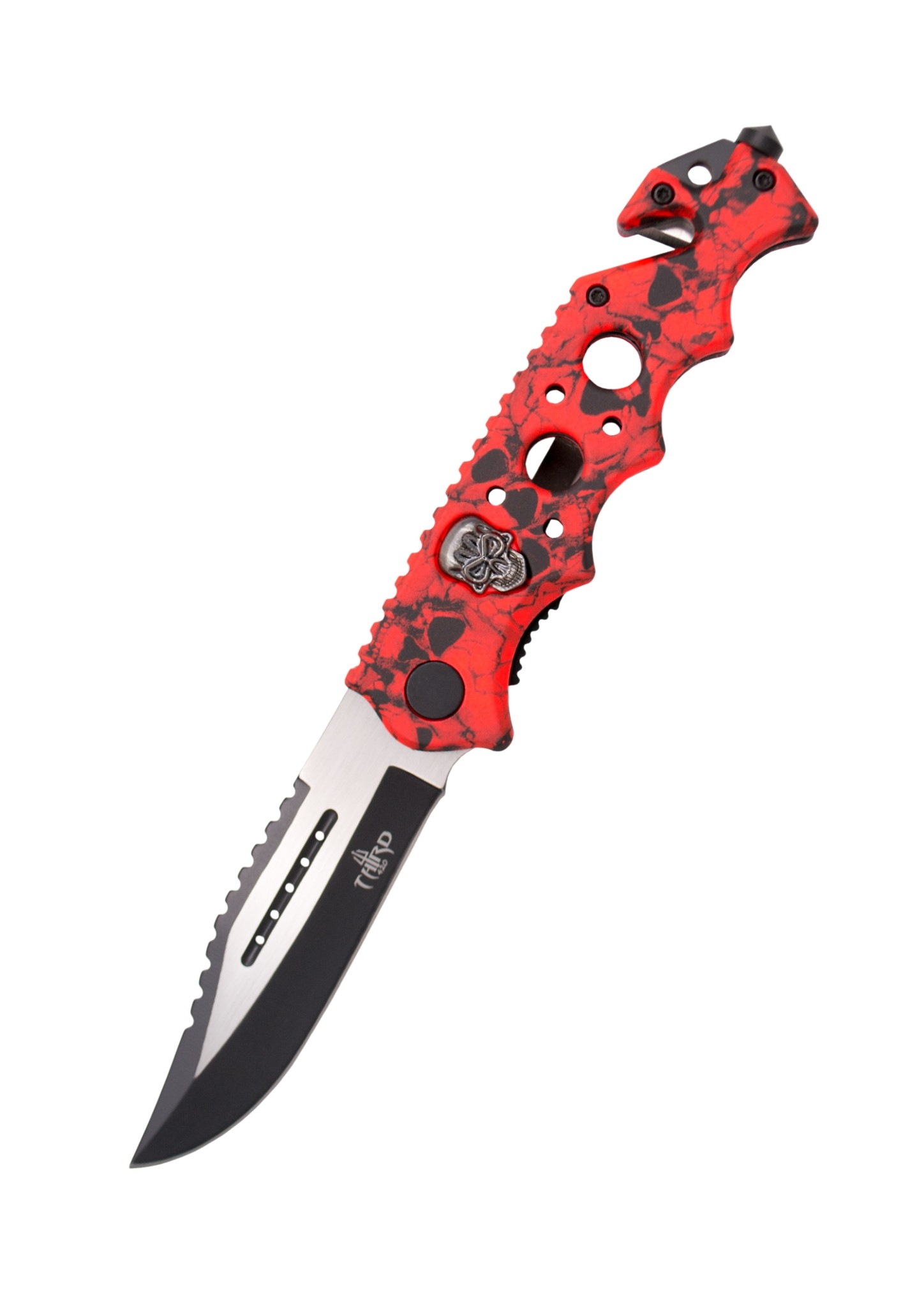 Third N88R pocket knife with an aluminum handle and a red camouflage skull pattern, holes in the handle and a skull. 9 cm satin-finished blade with a horizontally scribed pattern, black kerf, and black details. With clip. Ref. N88R Model: N88R Handle: Aluminum with camouflage coating Blade: Stainless steel Blade Size: 9 cm Blade Thickness: 2.75 mm Cutting Depth: 8.5 cm Handle Size: 12.2 cm Total Length: 21.2 cm Weight: 126 g With clip