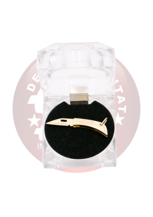 Third Miniature Pocket Knife Model N89-2 420 steel blade with gold titanium finish measuring 1.67 cm, polished steel handle with gold titanium plating, with presentation box. Ref. N89-2 Model: N89-2 Handle: Steel Blade: 420 Steel Blade Size: 1.67 cm Blade Thickness: 1.15 mm Cutting Depth: 1.37 cm Handle Size: 2.27 cm Total Length: 3.94 cm Weight: 3 gr