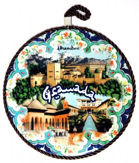 Salvamanteles con motivos árabes o granadinos. Realizado en cerámica y corcho.Ribeteado de cordón que permite usarlo como decoración colgándolo de la pared. Medida 17 cm Ø
