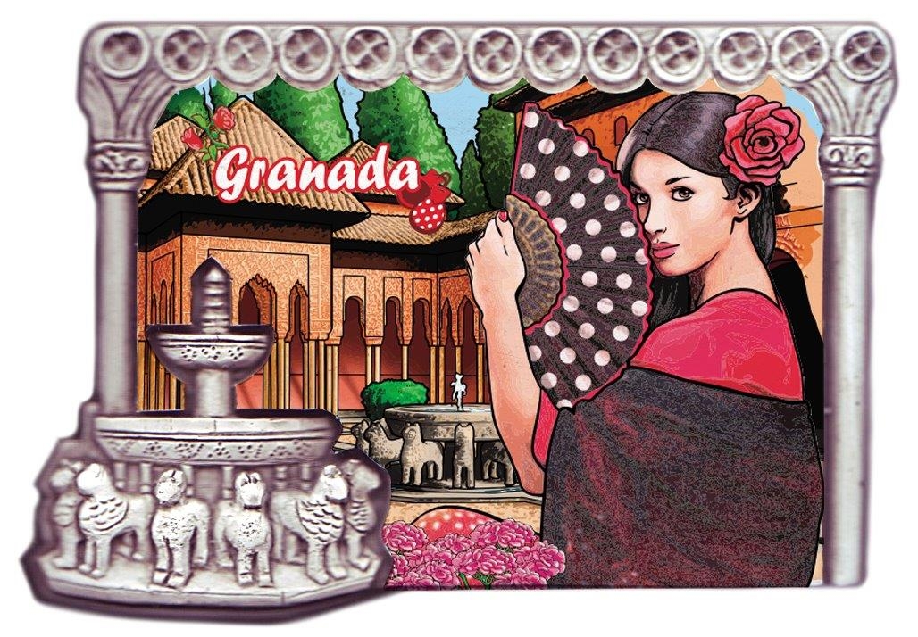 Imán Patio de los Leones de Granada en relieves con gitana en resina policromada de medidas 7 x 5 cm.