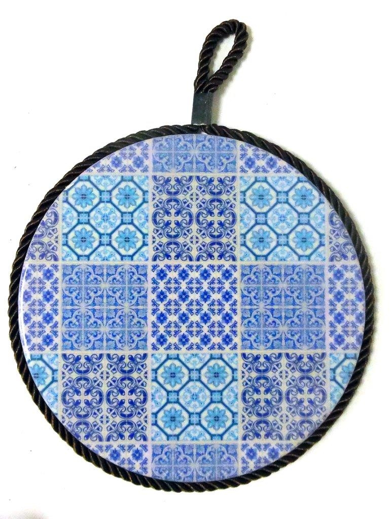 Salvamanteles con motivos árabes o granadinos. Realizado en cerámica y corcho.Ribeteado de cordón que permite usarlo como decoración colgándolo de la pared. Medida 17 cm Ø
