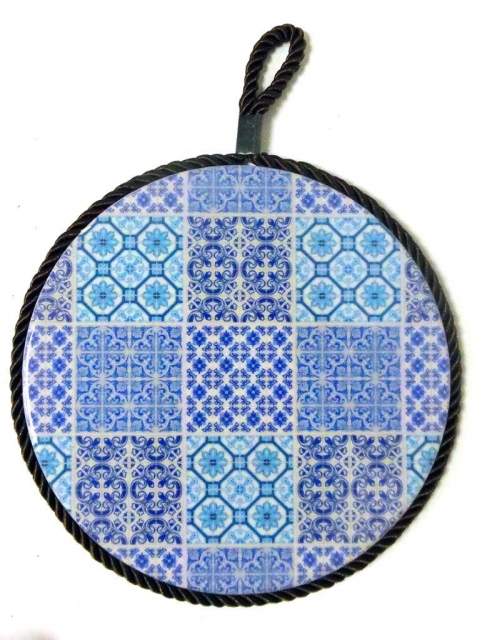 Trivet with Arabic motifs or Grenadians. Made of ceramic and cork. Welt cord that allows use as a hanging wall decor. Measure 17 cm Ø