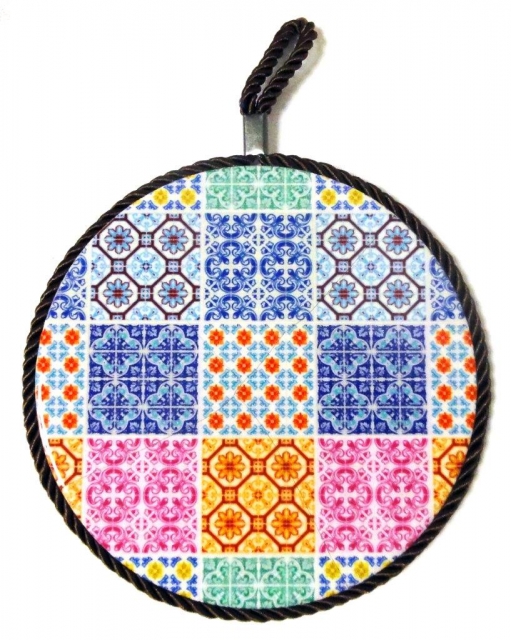 Trivet with Arabic motifs or Grenadians. Made of ceramic and cork. Welt cord that allows use as a hanging wall decor. Measure 17 cm Ø