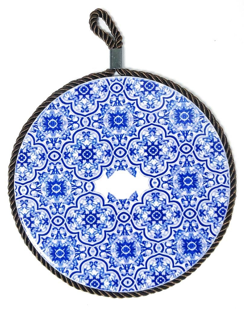 Trivet with Arabic motifs or Grenadians. Made of ceramic and cork. Welt cord that allows use as a hanging wall decor. Measure 17 cm Ø