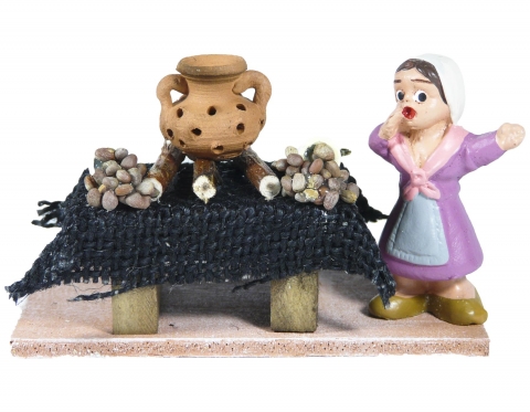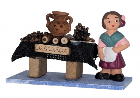 Pastor/a con mesa mini de castañas. Medidas aproximadas: 9 x 5 x 6 cm. Modelado en barro por Alborox en 4 cm. Foto orientativa debido al carácter artesanal de la misma.