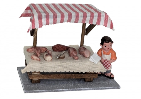 Puesto de carnicería para figuras de 4-5 cm de barro granadino de Alborox. Foto orientativa debido al carácter artesanal de la misma. Medidas 11.5x7x9 cm.