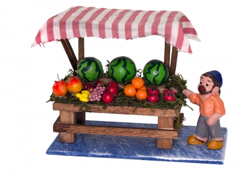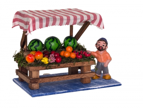 Puesto de frutas y verduras con toldo para figuras de 4-5 cm de barro granadino de Alborox. Foto orientativa debido al carácter artesanal de la misma. Medidas 11.5x7x9 cm.