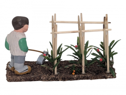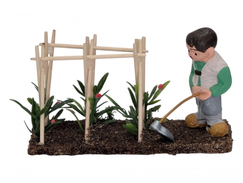 Tomato plants with a 4cm figure made of Granada clay. Dimensions: 10x4.5x5cm. Scene made by Lola.