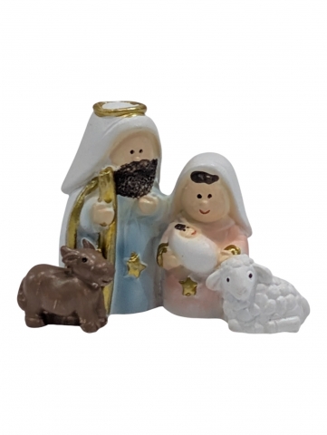 Nacimiento infantil Resina 4.7cm. Sagrada familia con San jose barba y virgen rezando con oveja y buey.