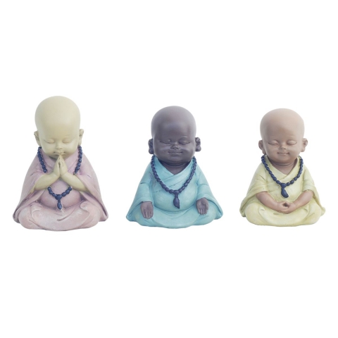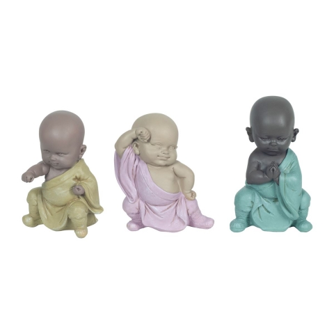 Three Buddhas Set seated in resin with patina in bronze finish. Measures: 9 x 7 x 17 cm Weight: 175 Gr