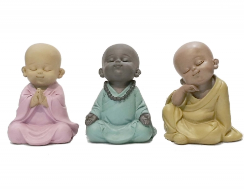 Juego tres budas sentados en resina con patina en acabado bronce. Medidas : 7,50 x 7 x 11 cm Peso : 145 Gr