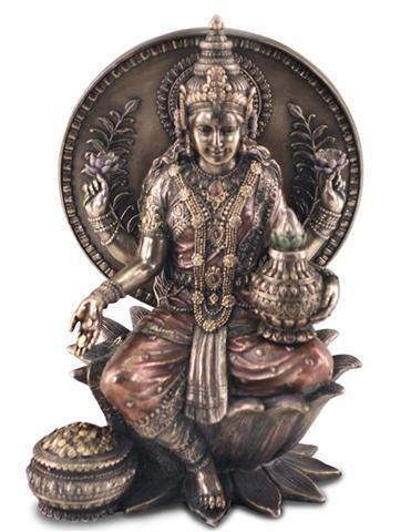 Figura Lakshmi sentado en resina con patina en acabado bronze. Medida figura 20x15x11 cm