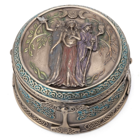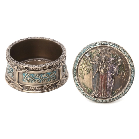 CELTIC TRIPLE GODDESS BOX, in resin with bronze finish patina. Measurements: 9.50 x 9.50 x 5.50 cm Weight: 300 g Brand: Veronese