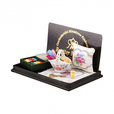Tailors Table decorated. Scale 1:12. Porcelana de Reutter. Weight: 38 g Width: 13.1 cm Length: 4.5 cm Height: 7.8 cm