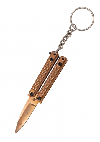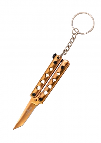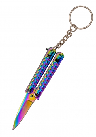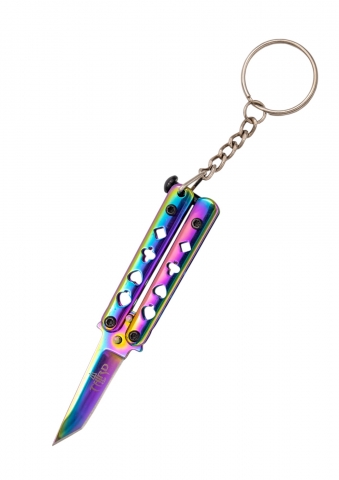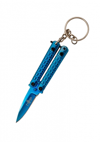 Third K0102A butterfly keychain knife with a 4.1 cm blade, polished titanium blue finish, and a pomegranate-textured handle. Ref. K0102A