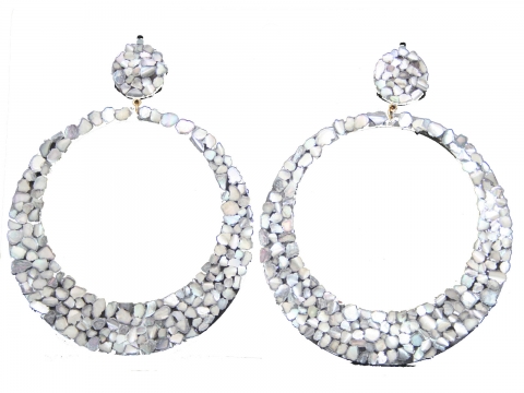 Pendientes en gris, con trozos de nácar, hecho a mano en España. Medidas 8 cm de diámetro.