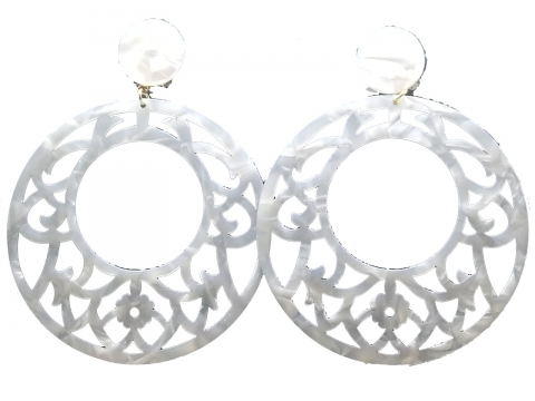 Pendiente en nácar visón calado, hecho a mano en España. Medidas 7 cm diametro.