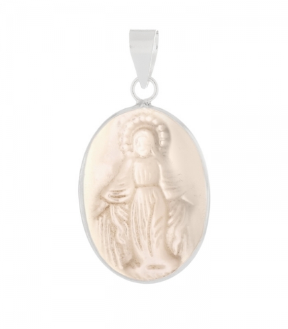 Miraculous Virgin Pendant. Material: 925 Sterling Silver, Mother-of-Pearl Mineral. Measurements: 21 x 15.5 mm.