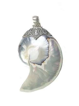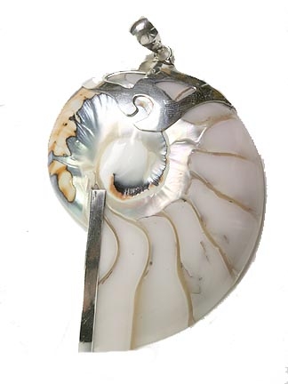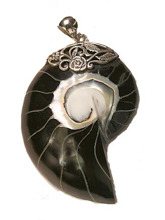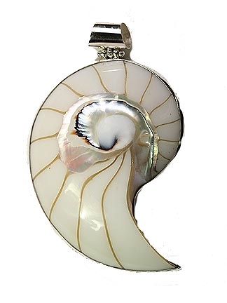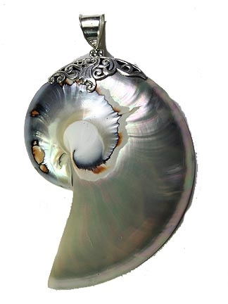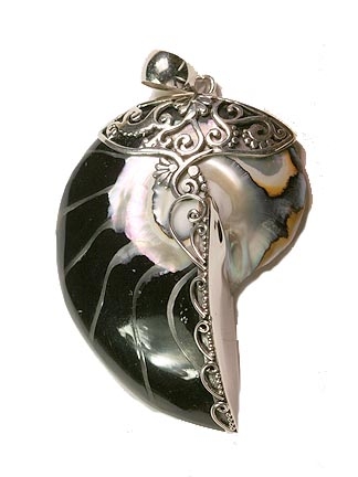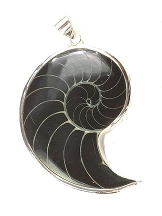 Silver Pendant Design Nautilus shell. Unique pieces seamed as Nautilus and crimping shape of silver craftsmanship. Photo guidance. Weight and measures for guidance: Gr 21 and 6 x 4.1 cm. Rare piece, black back.
