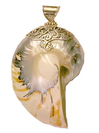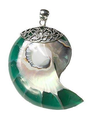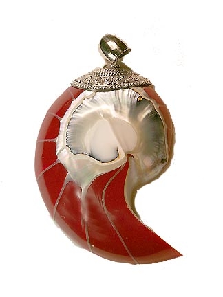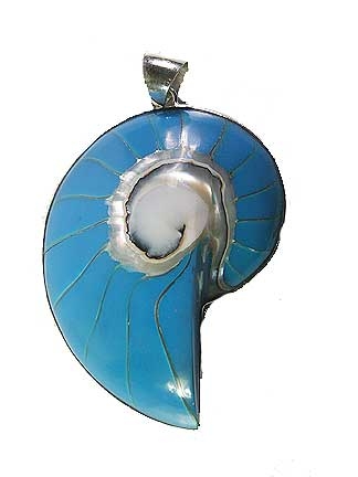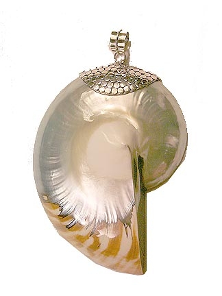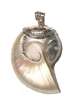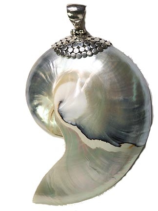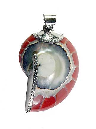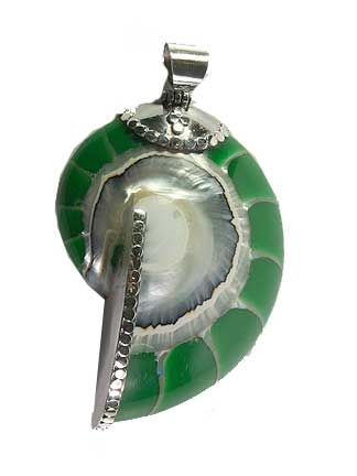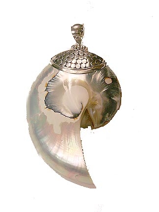 Colgante Diseño en Plata con concha de Nautilus. Piezas únicas engastadas según forma del Nautilus y engaste de plata artesanal. Foto orientativa. Peso y medidas orientativas : 21 Gr y 6 x 4.5 cm. Pieza rara , reverso negro.