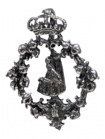 Sterling silver medal of the Virgin of Sorrows with a pomegranate border and openwork crown. Dimensions: 35 x 30 mm.