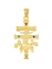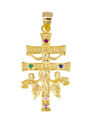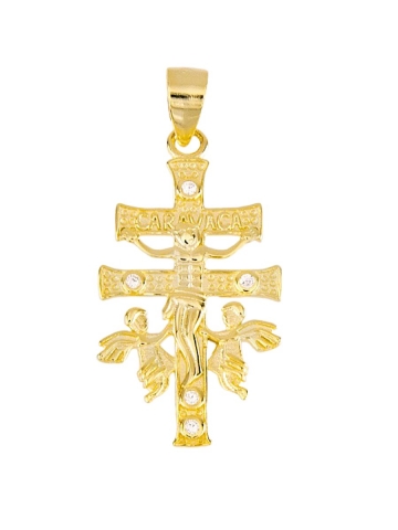 Cruz de Caravaca en plata de ley chapada con zirconitas dorado. Disponible en varios tamaños.