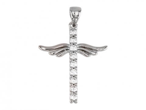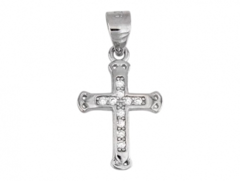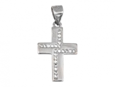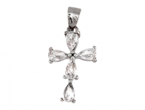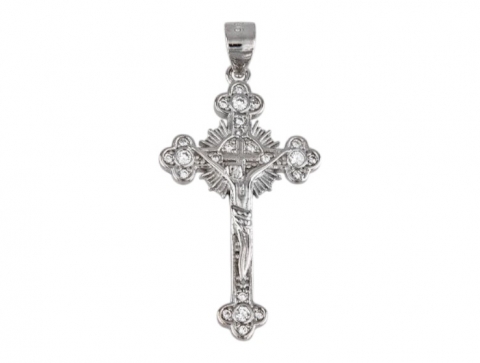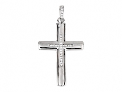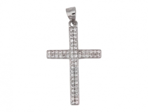 Rhodium-plated silver cross pendant with cubic zirconia.