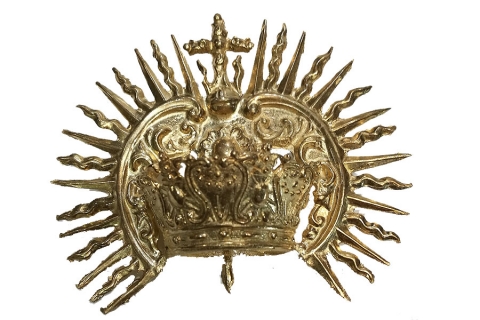 Corona Imperial en latón dorado. Medida corona 3 cm Ø inferior y 4.5 cm Ø superior y las potencias de 9.50 cm x 9.50 cm.