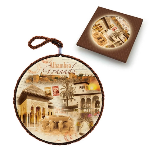 Classic embossed Granada magnet with sunset. Measures 7 cm.