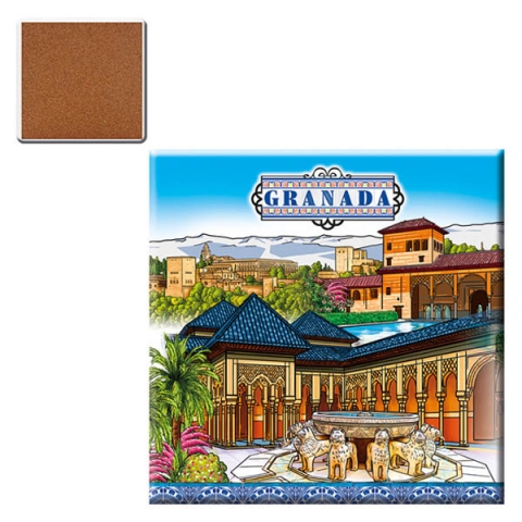 Posavaso Granada 10x10 cm. Base de corcho y superficie gráfica con fijación plastificada.