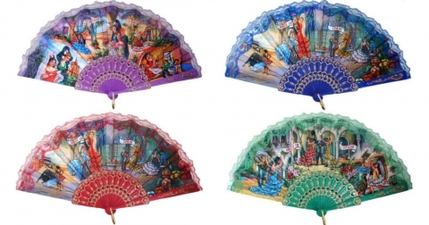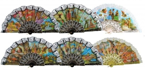 Abanico de plástico recuerdo con folkores con puntilla de 23 cm. Colores surtidos.