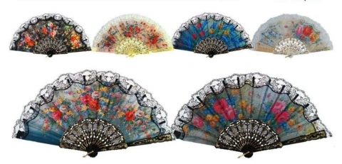 One-sided plastic fan with flowers and lace, 23 cm. Assorted colours.