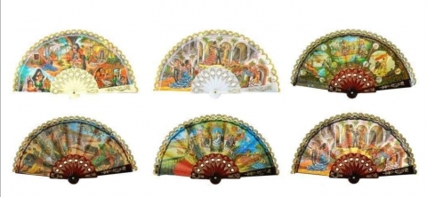 Souvenir plastic fan with folk ornaments and lace, 23 cm. Assorted colours.