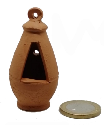 Oval lantern made of clay by hand. Approximate measurements: 5.37 cm. high and 2.8 cm wide. With hole to install a microbulb.