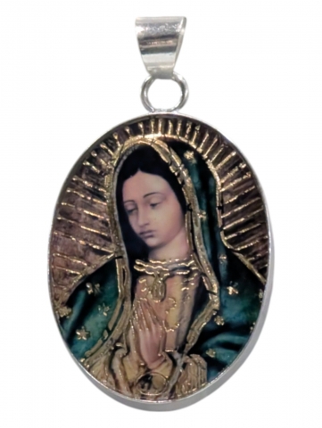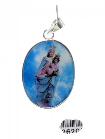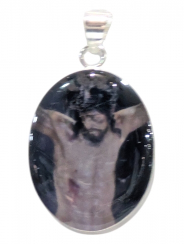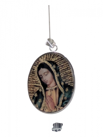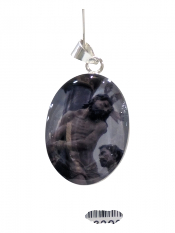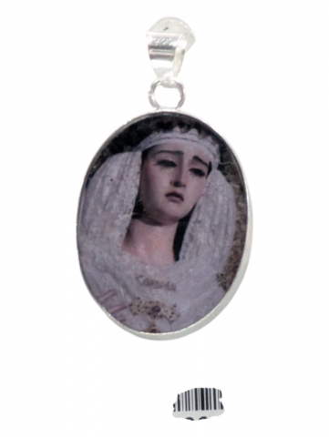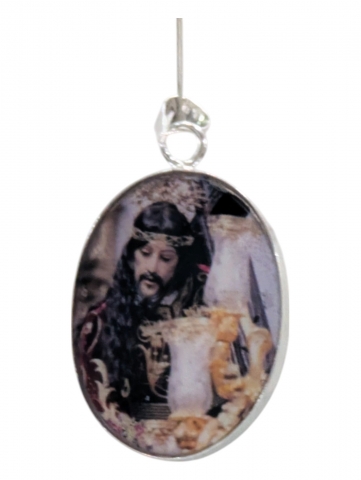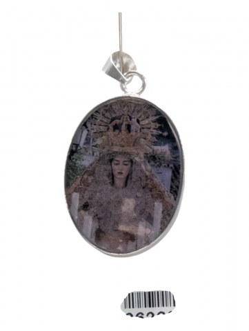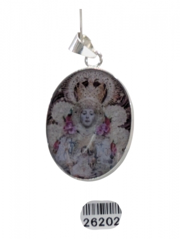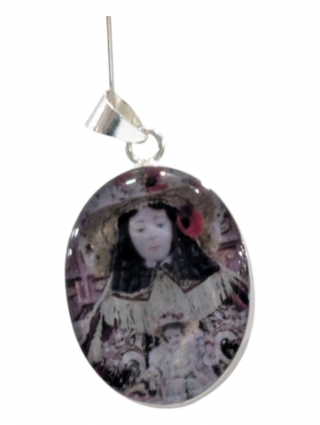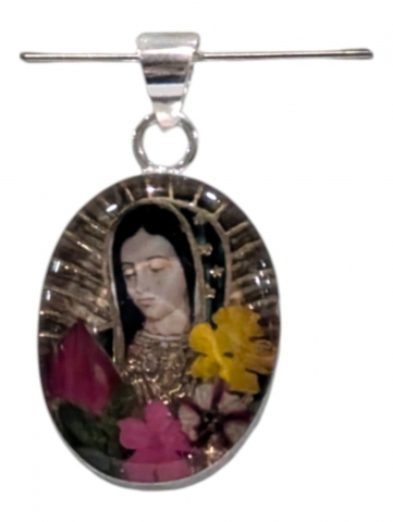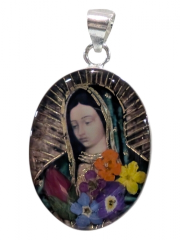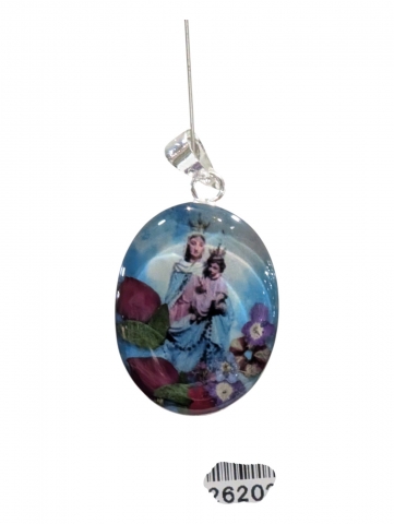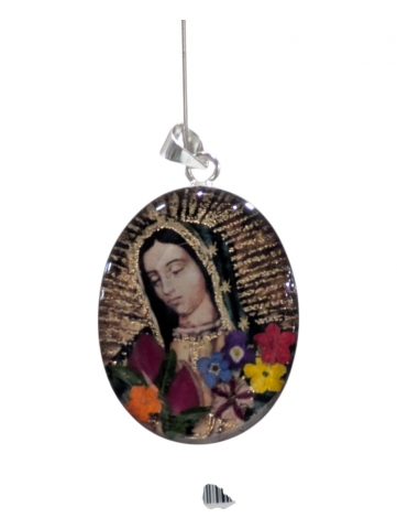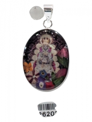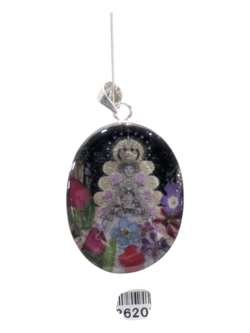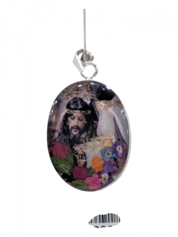 Colgante con imagen , decorado con flores secas y pintado encima . Inclusiones en epoxy o resina transparente. Tamano 40 mm h. Foto orientativa debido al carácter artesanal de la pieza.
