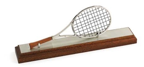 Raqueta de tenis en plata de ley con base de madera..Diseño Opera . Medidas 20 cm.